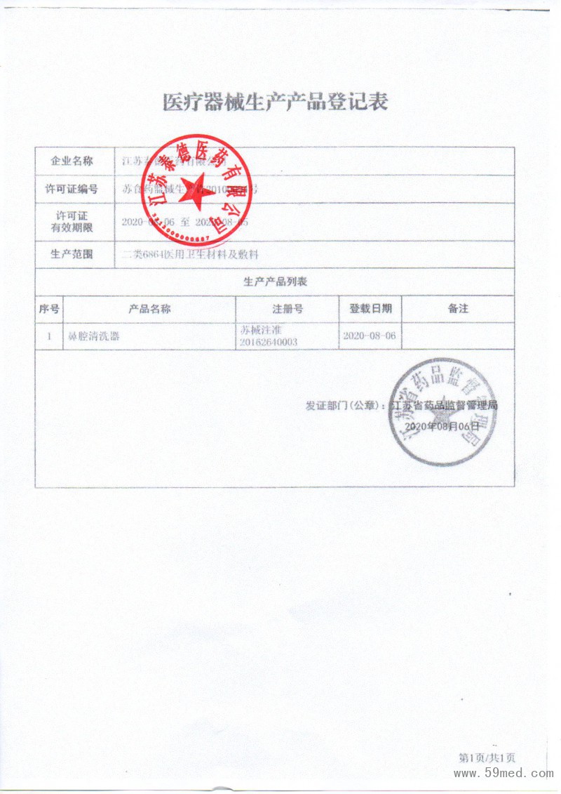 | 發(fā)證機(jī)構(gòu): | ??江蘇省藥品監(jiān)督管理局 | 發(fā)證時間 : | ??2020-08-06 |