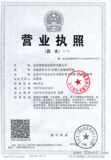 | 發(fā)證機(jī)構(gòu): | ??北京市工商行政管理局豐臺分局 | 發(fā)證時(shí)間 : | ??2018-03-29 |