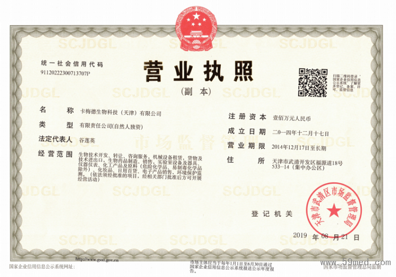| 發(fā)證機(jī)構(gòu): | ??天津市市場(chǎng)管理局 | 發(fā)證時(shí)間 : | ??2019-08-21 |