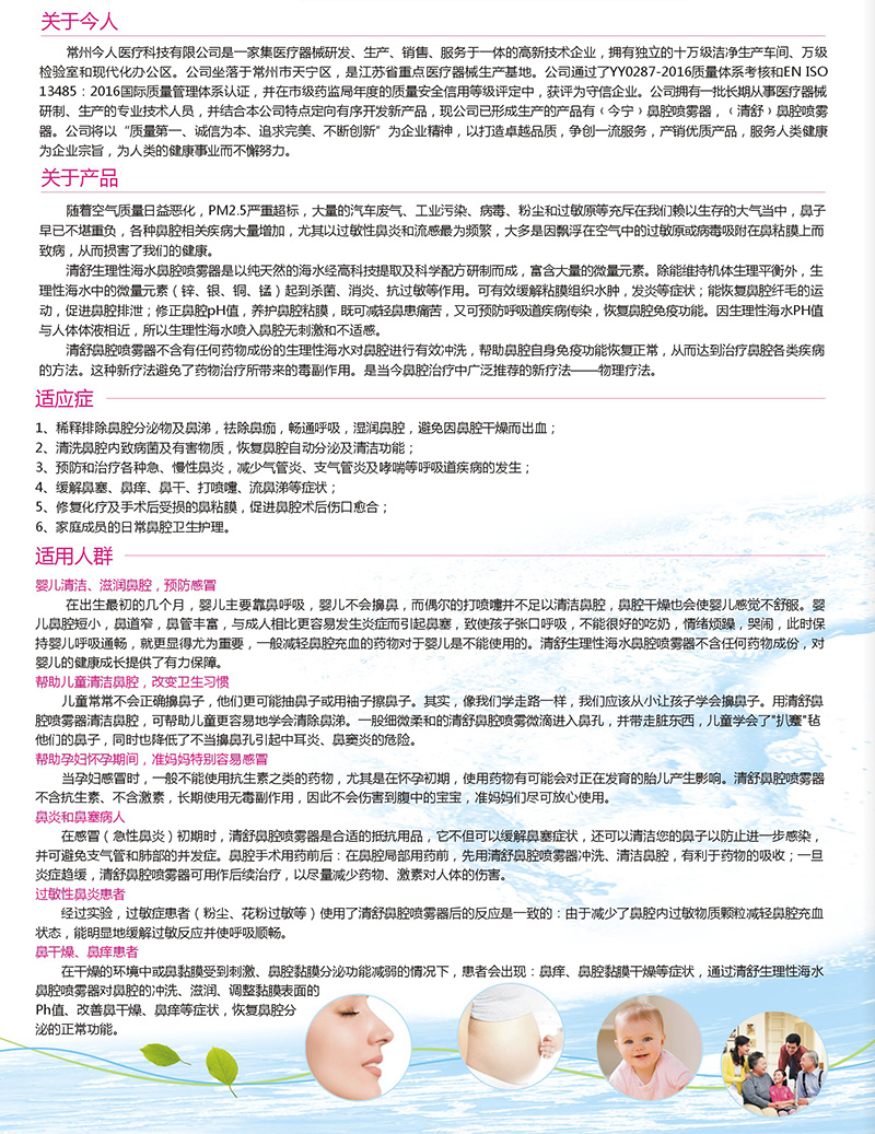 今人生理性海水鼻腔噴霧器是以純天然的海水經(jīng)高科技提取及科學配方研制而成,富含大量的微量元素。除維持機體生理平衡外,還可以起到殺菌、消炎、抗過敏的作用??捎行Ь徑庹衬そM織水腫,發(fā)炎等癥狀;能恢復鼻腔纖毛的運動,促進鼻腔排泄;修正鼻腔pH值,養(yǎng)護鼻腔粘膜,恢復鼻腔免疫功能。