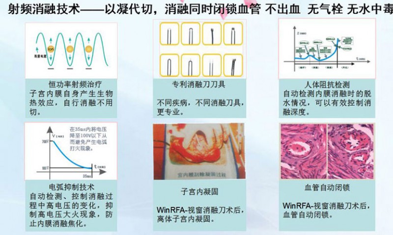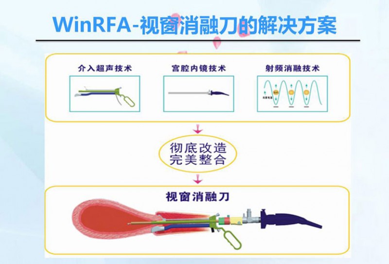 WinRFA•視窗消融刀是在雙重可視的監(jiān)控下,通過(guò)具有剪切、止血、凝固、剔除四大功能的消融刀具經(jīng)陰道、宮頸等自然腔道,將射頻電磁波準(zhǔn)確地介入到病變部位上,射頻電磁波激發(fā)病變組織的細(xì)胞進(jìn)行等離子振蕩,離子相互摩擦產(chǎn)生生物高熱效應(yīng),溫度達(dá)到80-100度,從而有效的消融病變組織并凝固血管,射頻治療系統(tǒng)能智能控制病變組織的變性程度和范圍,最后使病變組織變性、壞死和排出體外,達(dá)到治療子宮出血(DUB)、子宮切口(瘢痕)妊娠、腺肌瘤(?。┑燃膊〉哪康?。