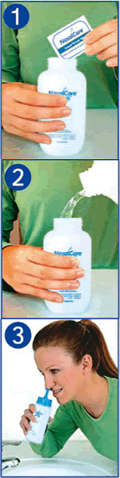 [安裝和使用說明] 1、先將一小袋內(nèi)的洗鼻劑全部倒入洗瓶內(nèi),然后將干凈溫水(與手溫相同,不要太熱)注到洗瓶的240毫升刻度線。蓋緊后用手握住洗鼻器瓶身,用食指堵住鼻塞器出口,搖勻。注:普通自來水便可,但鼻部手術(shù)后,須用瓶裝蒸餾水或消毒水。