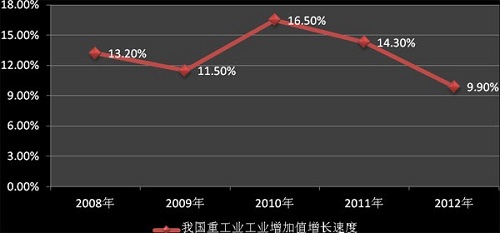 受到國(guó)際經(jīng)濟(jì)環(huán)境變動(dòng)的影響,我國(guó)重工業(yè)在迎來(lái)高速發(fā)展期之后,其行業(yè)增速于2012年初開(kāi)始有所放緩,呈現(xiàn)增長(zhǎng)下滑的態(tài)勢(shì),其主要的冶金礦山機(jī)械行業(yè)、物料搬運(yùn)設(shè)備行業(yè)、礦山機(jī)械行業(yè)等增長(zhǎng)情況亦受到影響。