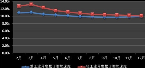 2012年我國(guó)重工業(yè)發(fā)展較為平穩(wěn),月度累計(jì)工業(yè)增加值增長(zhǎng)率最高為3月的11%,最低為9月的9.7%。長(zhǎng)期以來(lái),我國(guó)重工業(yè)發(fā)展速度一直快于輕工業(yè)的發(fā)展速度,但受到內(nèi)外經(jīng)濟(jì)增速放緩、內(nèi)需不足等因素影響,2012年我國(guó)輕重工業(yè)發(fā)展出現(xiàn)倒置現(xiàn)象。2012年2月,我國(guó)輕重工業(yè)工業(yè)增加值月度累計(jì)增加速度為12.7%、10.9%,至12月則發(fā)展為10.1%、9.9%。整體上看,雖然我國(guó)重工業(yè)發(fā)展增長(zhǎng)速度落后于輕工業(yè),但是其差距在逐步縮小。